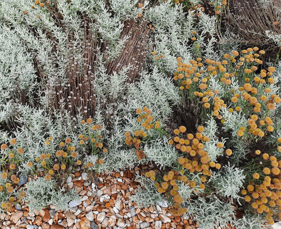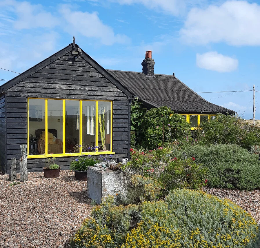 Your house is well kept, yellow window and door frames are bright against uniform black wood. My visit feels intrusive as I approach, so I busy my eyes with plants at shingle level and avoid looking inside. Tall fennel and salty-green domes of santolina fly flags of dry flowerheads. The wild mint you found on the Ness is still here, flowering purple amongst a Mediterranean aroma – but one I can never place or track down to an individual herb. Dots of magenta from sweet pea to roses to knapweed. Low-growing plants in front of the house are well suited to winds, tiny sedum and silvery sea kale. Behind, a fig tree claims the inside corner, covering a wall, palms curling with each gust. Is this the fig you nurtured from a cutting taken on your way home? It’s flourishing. Elder trees still guard the house, their old growth a crown of sticks covered by mustard-yellow lichen, and new growth rising. Just a rose bush between you and the power station prospect; the other way, the sea. Garden and creativity unbound, like the fun you and your friends made in the freedom of these waves and levels.